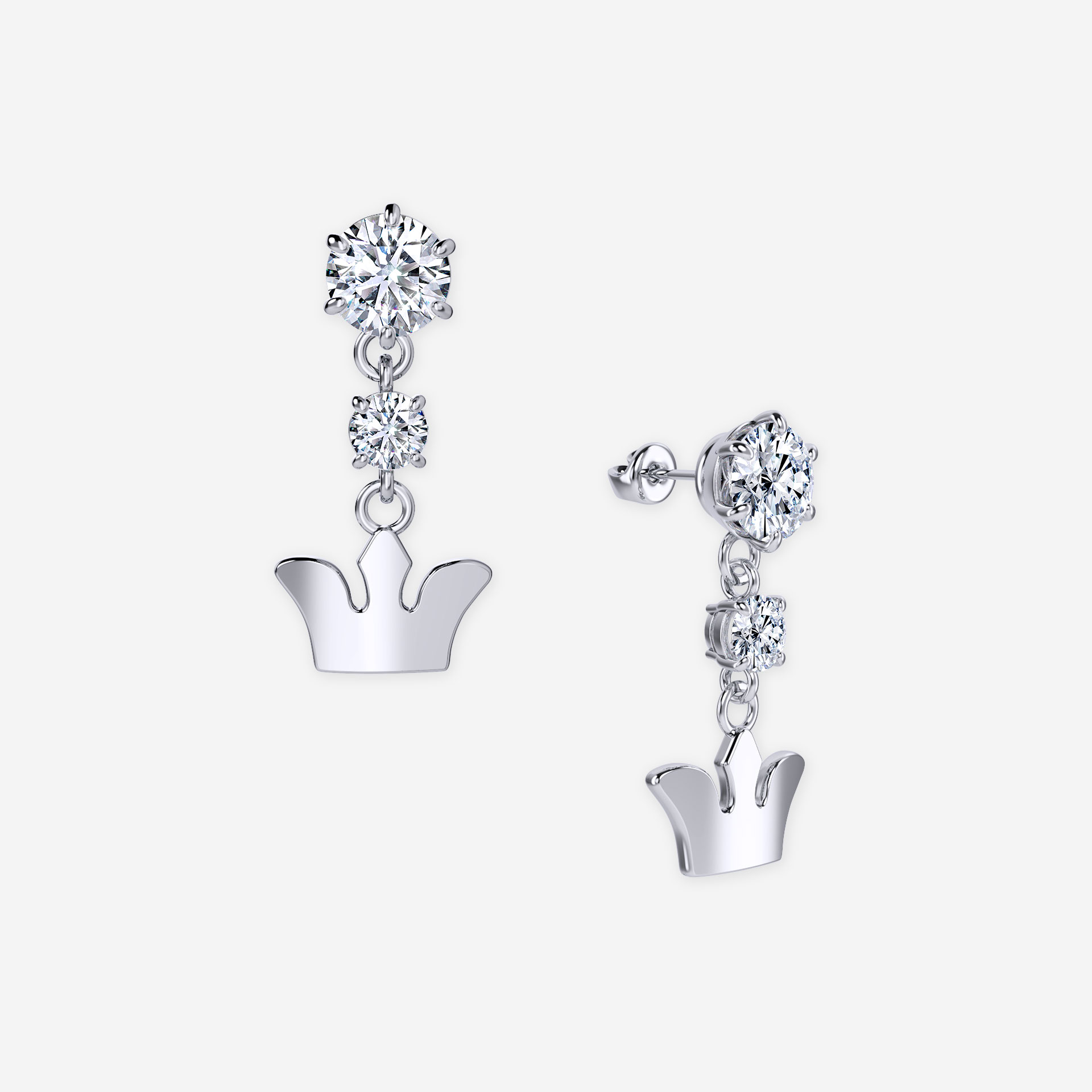 A glamorous expression, this dazzling pair of earrings features two brilliant-cut quartz diamond on each and includes a crown-shaped element for a truly regal look.