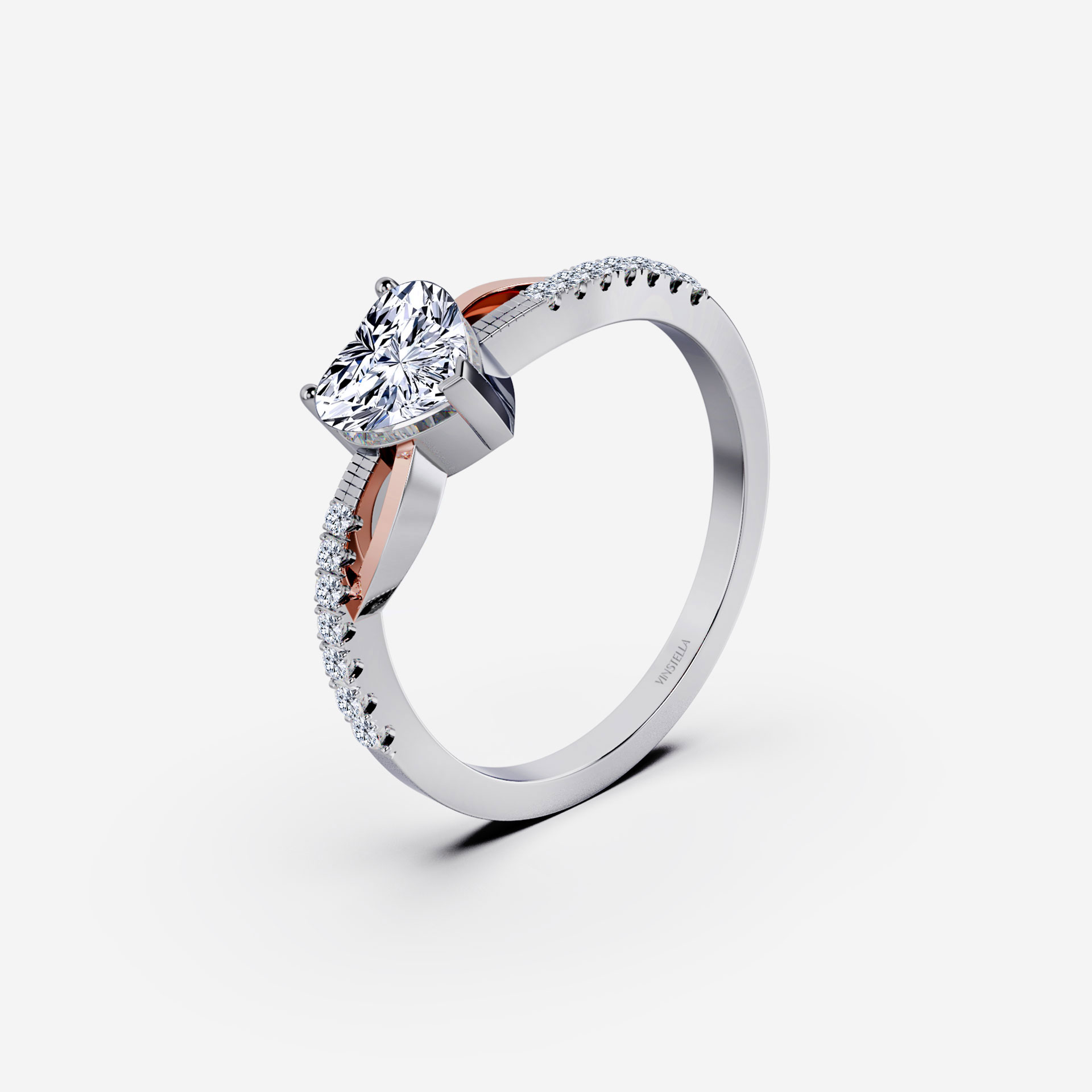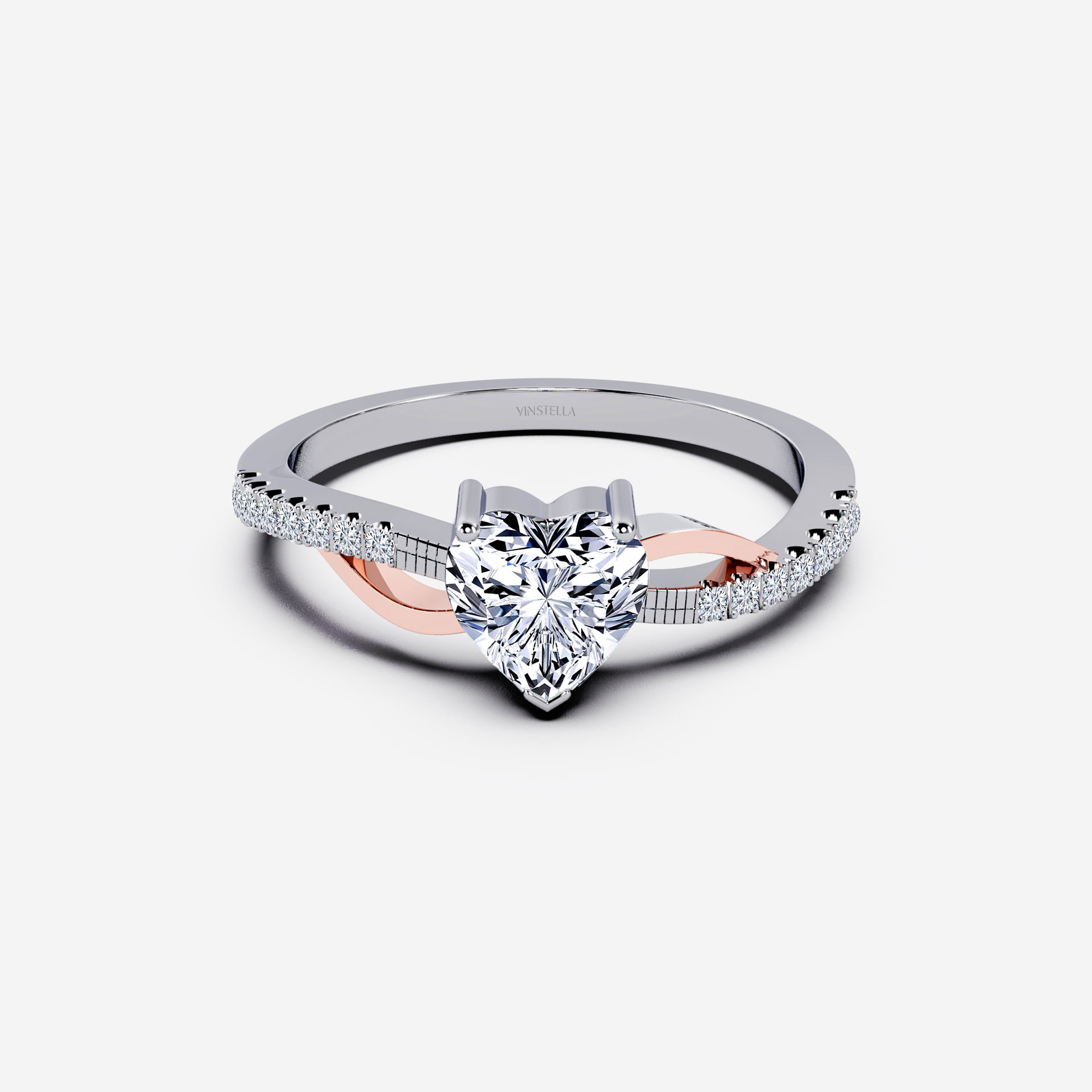 Petite quartz diamond with rose gold accented criss-cross details complimenting the heart shape centre stone, a bedazzling piece that speaks love and style.